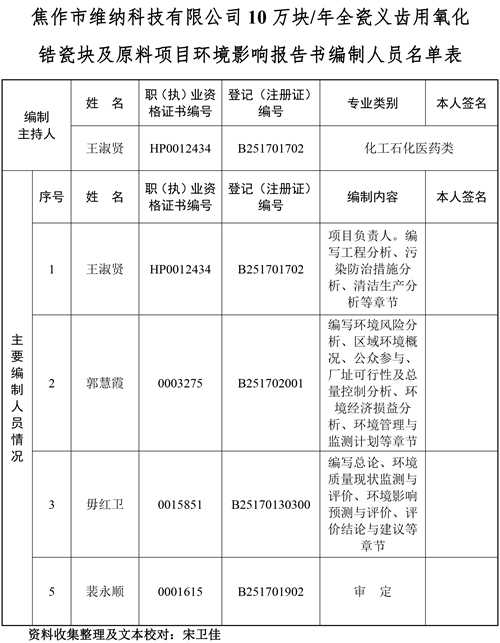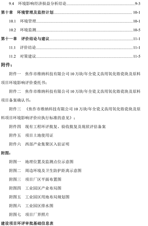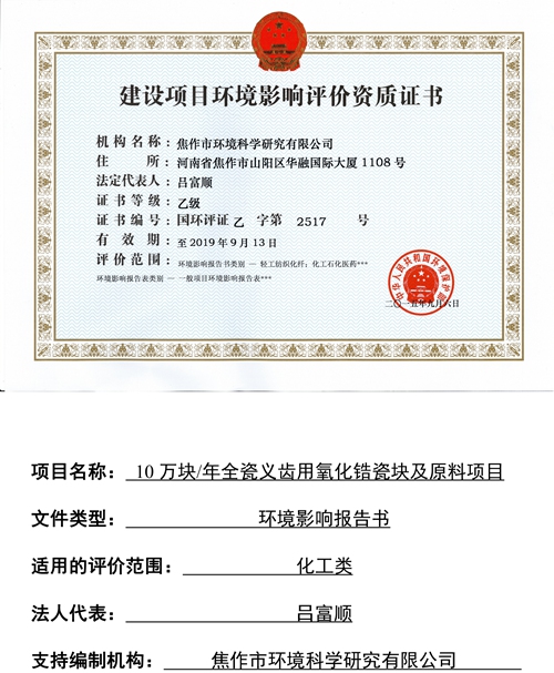 關(guān)于焦作市維納科技有限公司10萬(wàn)塊/年全瓷義齒用氧化鋯瓷塊及原料項目環(huán)評報告書(shū)信息公司。